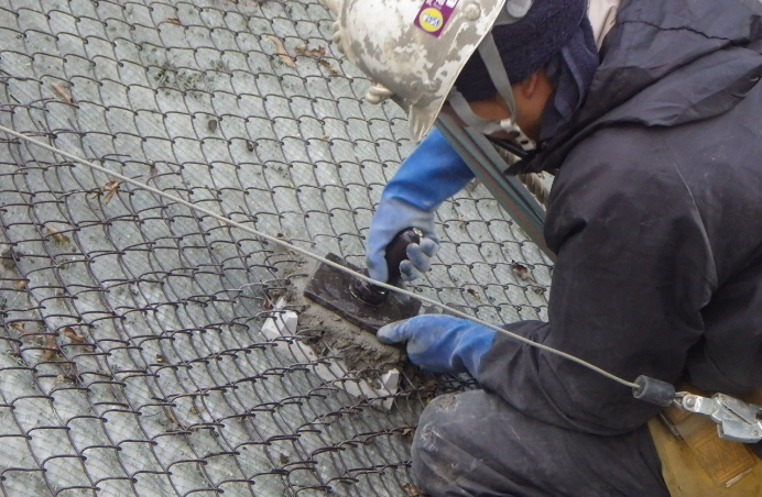 仮設足場を必要としないグラウンドアンカー工法。専用削孔機をワイヤーロープで法面に固定しロープ足場で施工する。