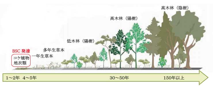 | BSCとは、バイオロジカル・ソイル・クラスト(Biological Soil Crust)の略称です。 糸状菌類、土壌藻類、地衣類および苔などが地表面の土粒子や土塊を絡めて形成するシート状の土壌微生物のコロニーのことです。 自然な植生遷移の最初に形成される土壌藻類等によるBSCが浸食防止効果を持つことに着目し、より早期に在来藻類によるBSCを形成して植生遷移をスタートさせる、環境にやさしい技術です。 NETIS(新技術情報紹介システム)登録番号OK-170002-VR) |