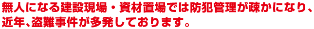 | そこで、無人の建設現場・資材置場に効果的なセキュリティが「タイガード」です。 防犯効果だけでなく建築会社様の便利機能としてもお役立てできます。 |